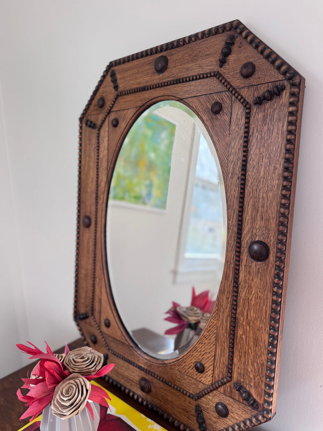Antique Early 1900's Beveled Oak Mirror